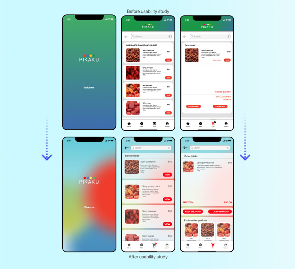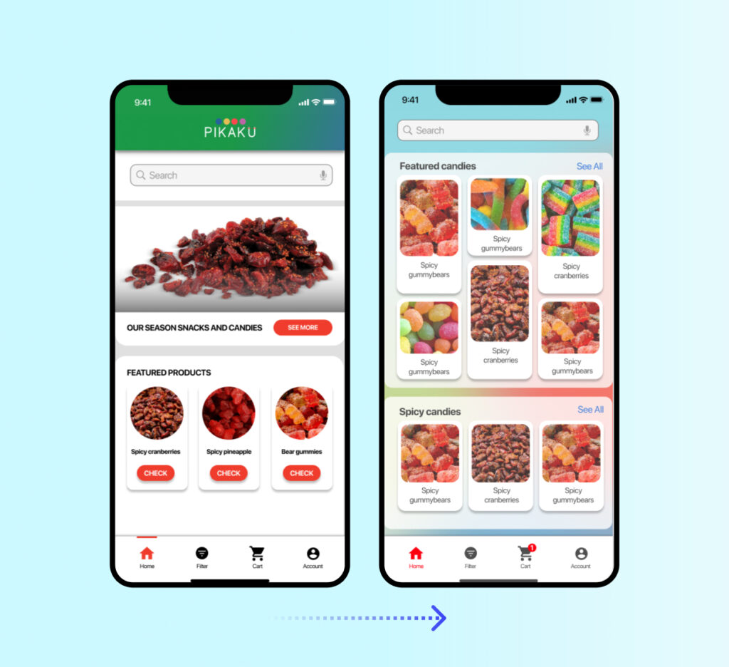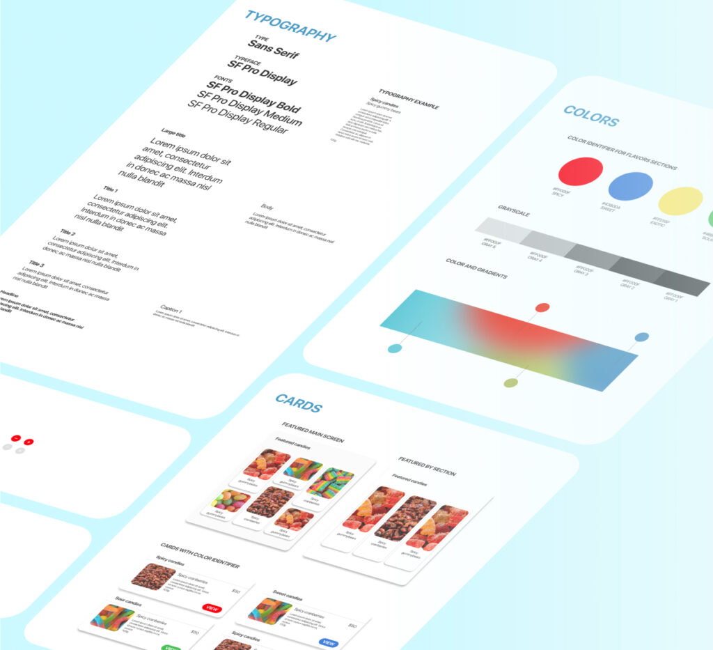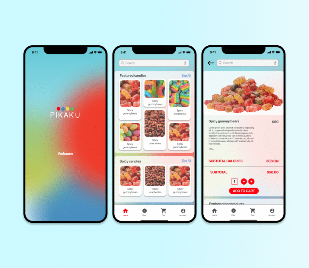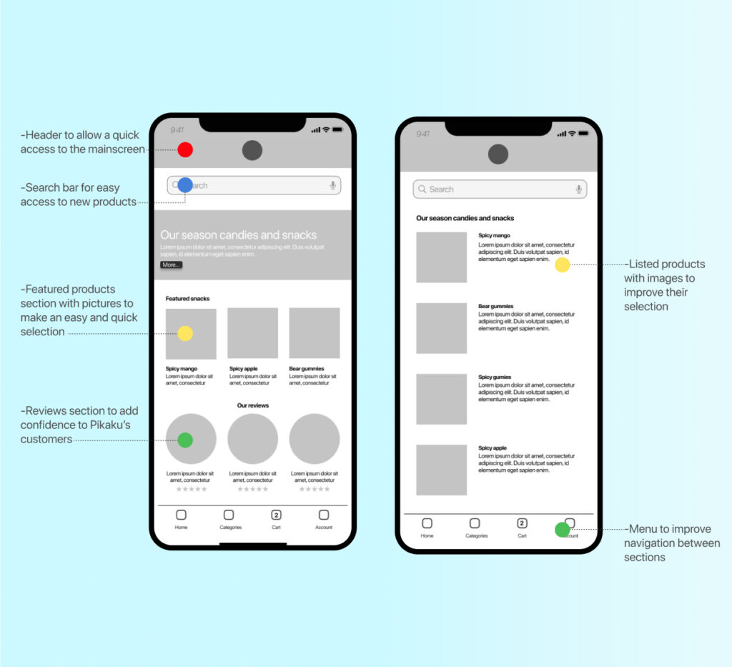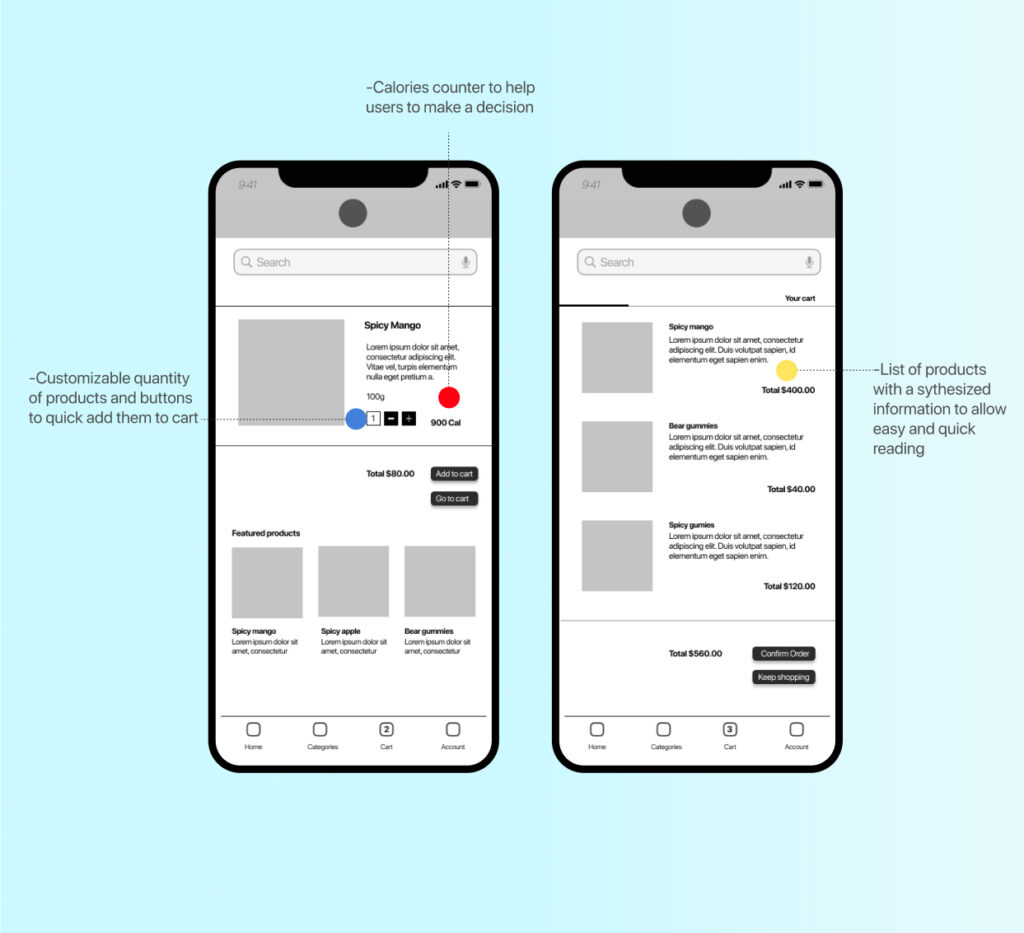 After designing the main wireframes on paper, the next part of the process was digitalizing and starting different wireframes to decide which could be a convenient configuration for the user, after many iterations, it was found that a minimal home screen could improve readability because of this the screen was divided into five sections: a header, a search bar, season candies, featured products and a review section. Below the application, it was added a menu section to improve navigation and the images were sized to 100px per 100px to help the user to select and visualize products.