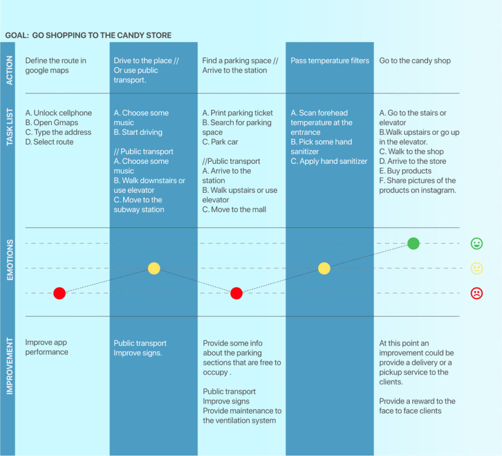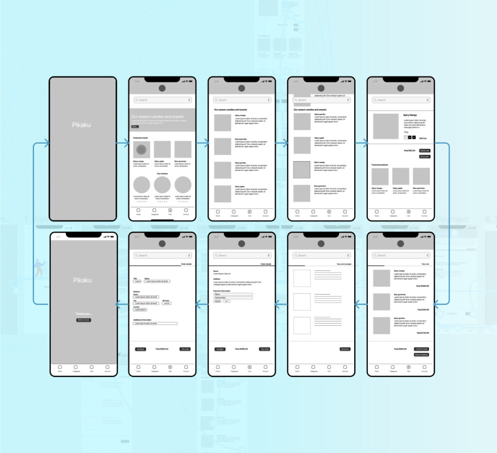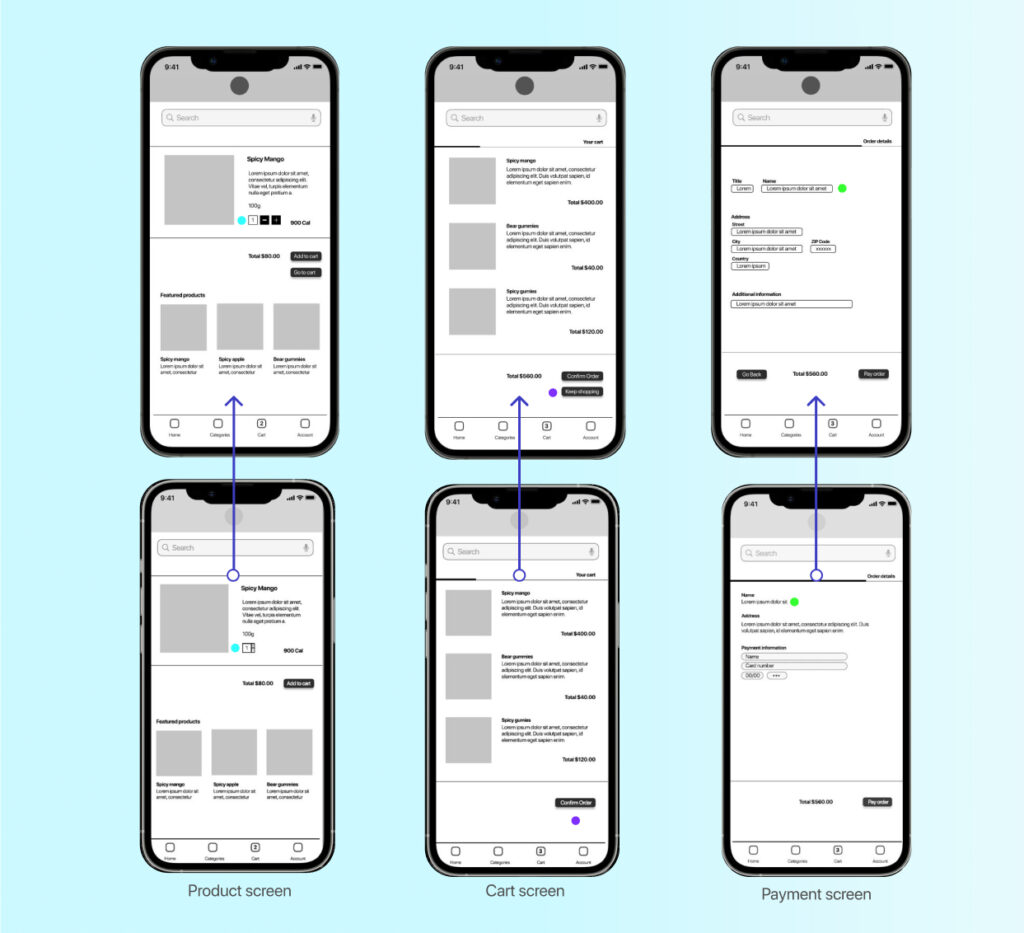 Once the screens were designed, the next step was planning the interaction between screens. The objective of the main flow was to finish the buying process of a product and go to the main screen again. This process allowed us to find the pain points and make some adjustments in the product interactions.