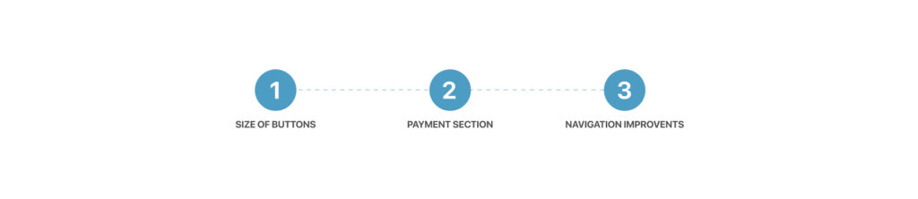 To resolve this in the product screen the size of the buttons to add and subtract products was modified(1), in the cart screen (2) the navigation was improved to allow users to keep shopping and the payment section (3) was improved by allowing the user to change payment methods and the information was divided by chunks to help user to focus in small steps of information.