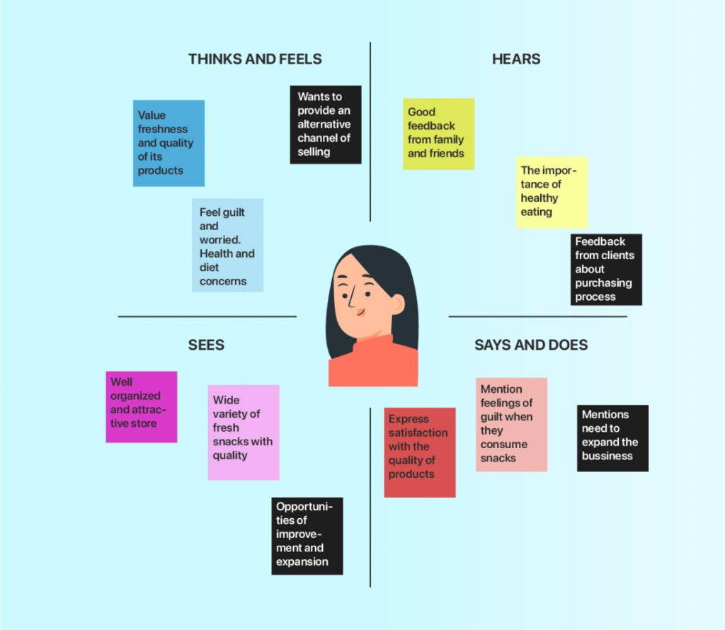 After the first set of interviews, it was necessary to filter the most important information. By identifying the most recurrent topics, an empathy map was created to address the main issues concerning Pikaku’s services. This map helped to visualize the clients’ experiences, needs, and emotions, providing a clearer understanding of how to improve and tailor the services offered.