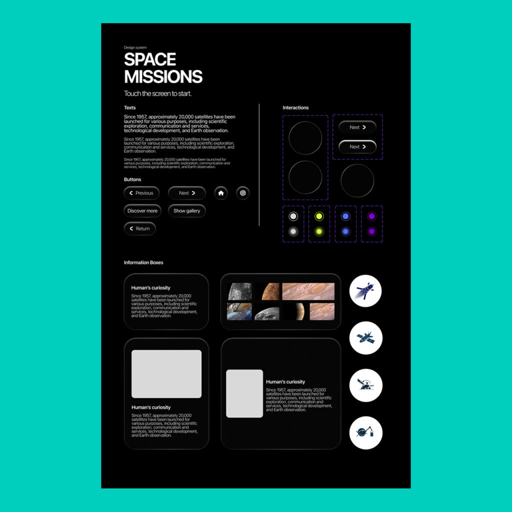 The educational interface for Space Explorers was designed to enhance the user experience through an intuitive flow and a modern design system. Allowing the user to navigate through the history and discoverings of URSP’s.