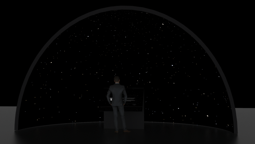 This immersive dome surrounds the user in a spatial atmosphere, aiming to make them feel the sensation of navigating through space. The dome is interactive, consisting of an arrangement of lights and projections that respond to the sounds of the installation — actual recordings of space sounds from various missions or URPs.